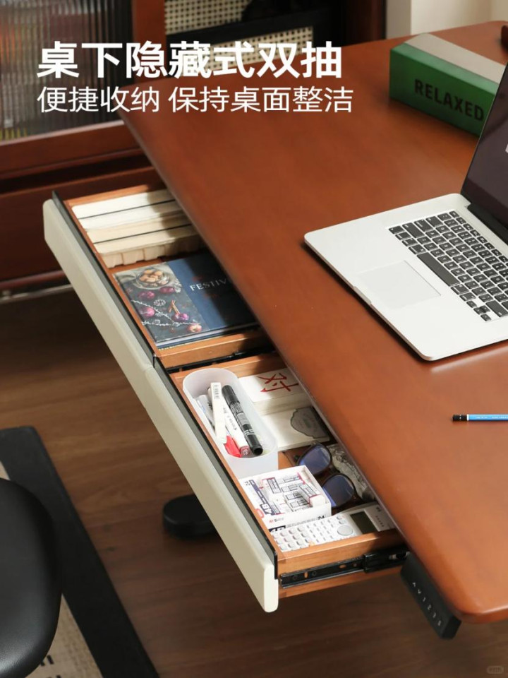 更妙的是它的"应急能力"。去年感恩节,突然多了六位朋友来家里聚餐,我愣是把这张桌子推到了客厅,宽大的桌面承载了中西合璧的丰盛。平时呢?双抽设计藏起了无数杂物——发票、文具、充电线,桌面只留一台Mac、一盏护眼灯和一杯水,极简得令人舒心。桌底的理线槽更是治愈了我的强迫症,告别蜘蛛网般的线缆,连扫地机器人通过都毫无障碍。